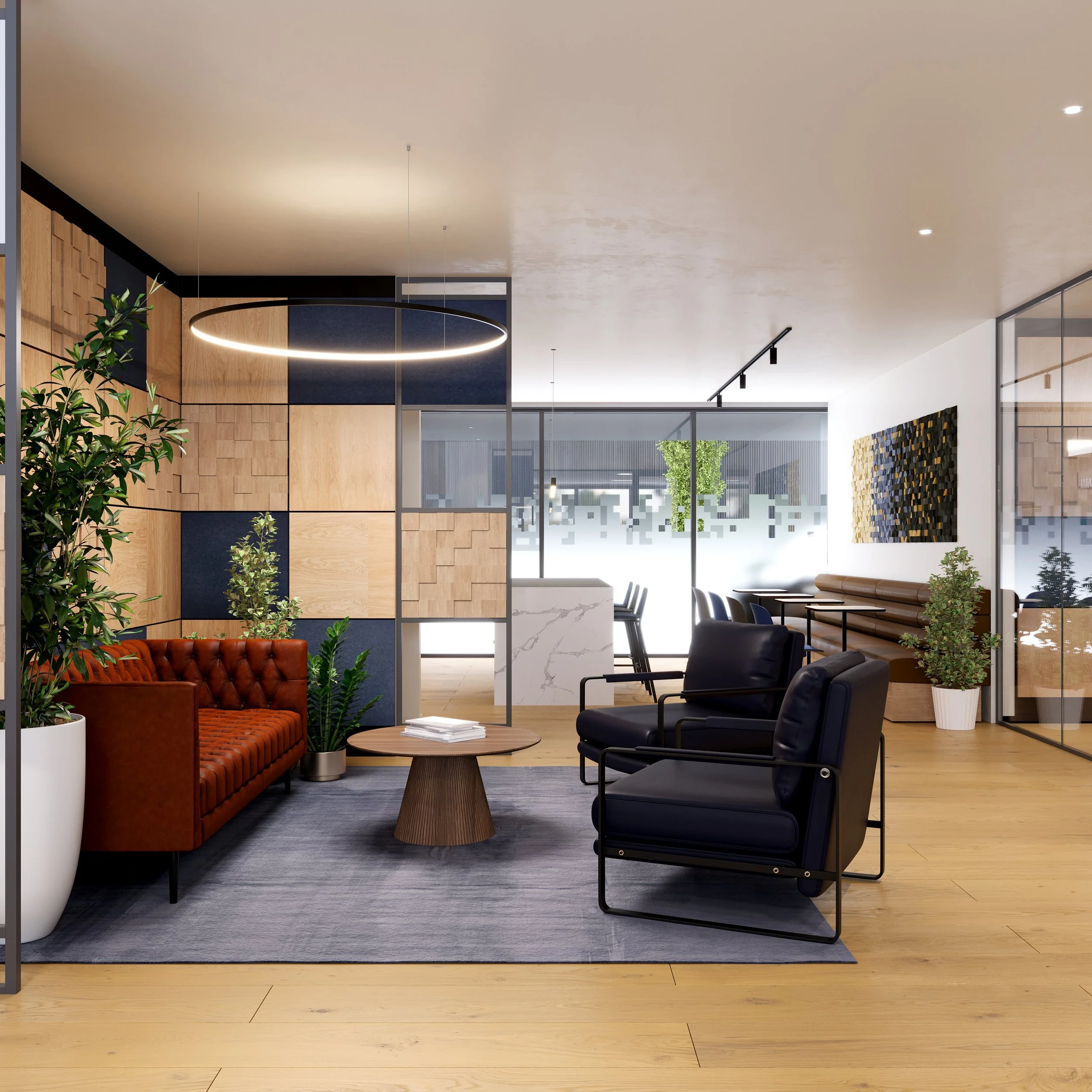 A centrally located lounge area offers a warm, yet polished first impression – welcoming visitors with plush seating and a relaxed, contemporary atmosphere.