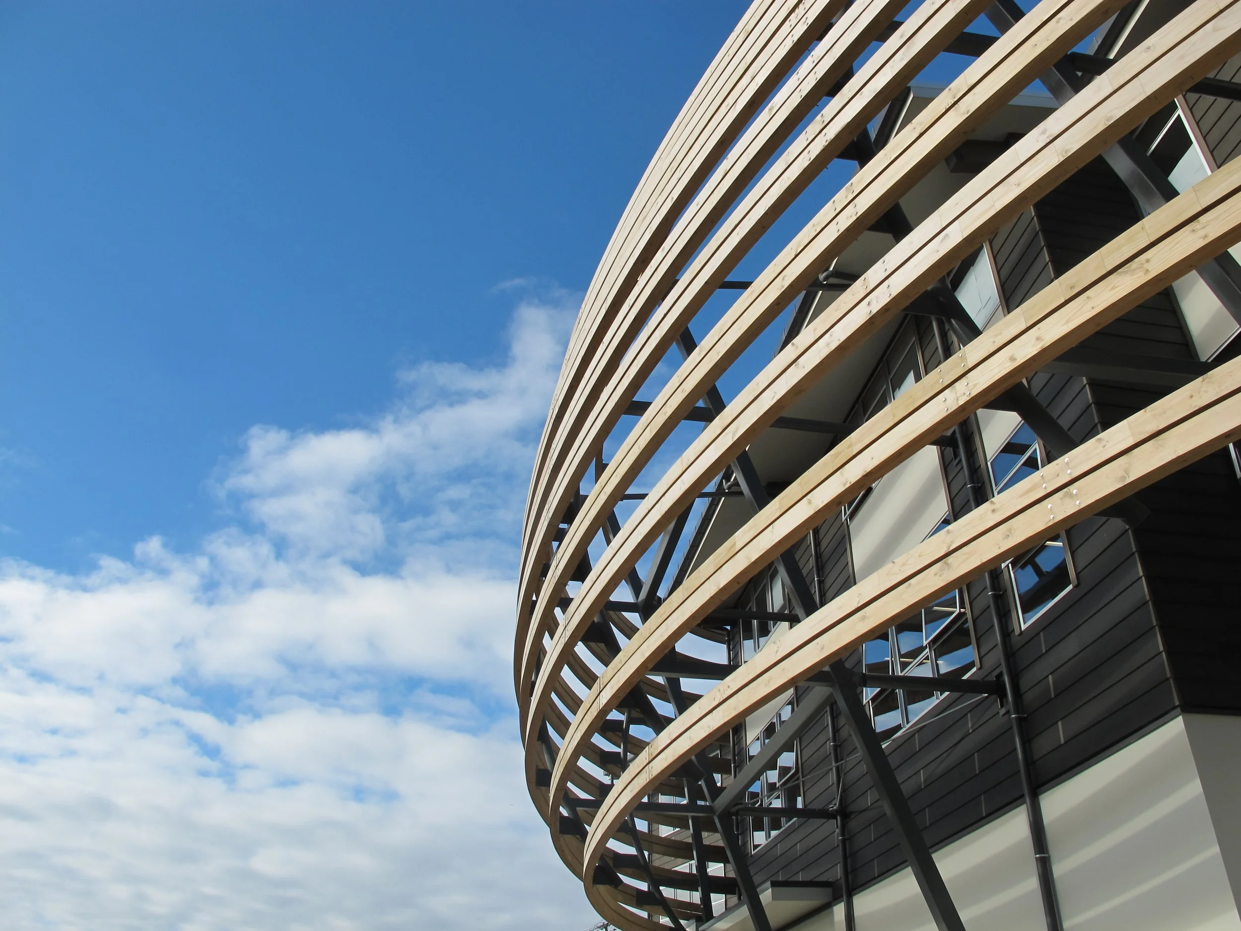 A feature slat screen of Glulam beams creates a strong identity for the building while providing solar shading. The building uses passive ventilation systems to provide cooling that minimises energy use.