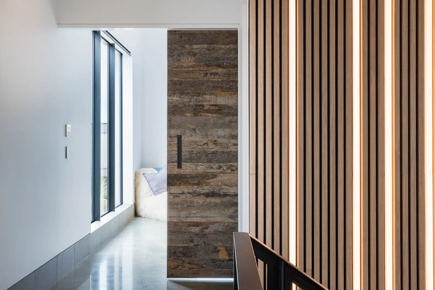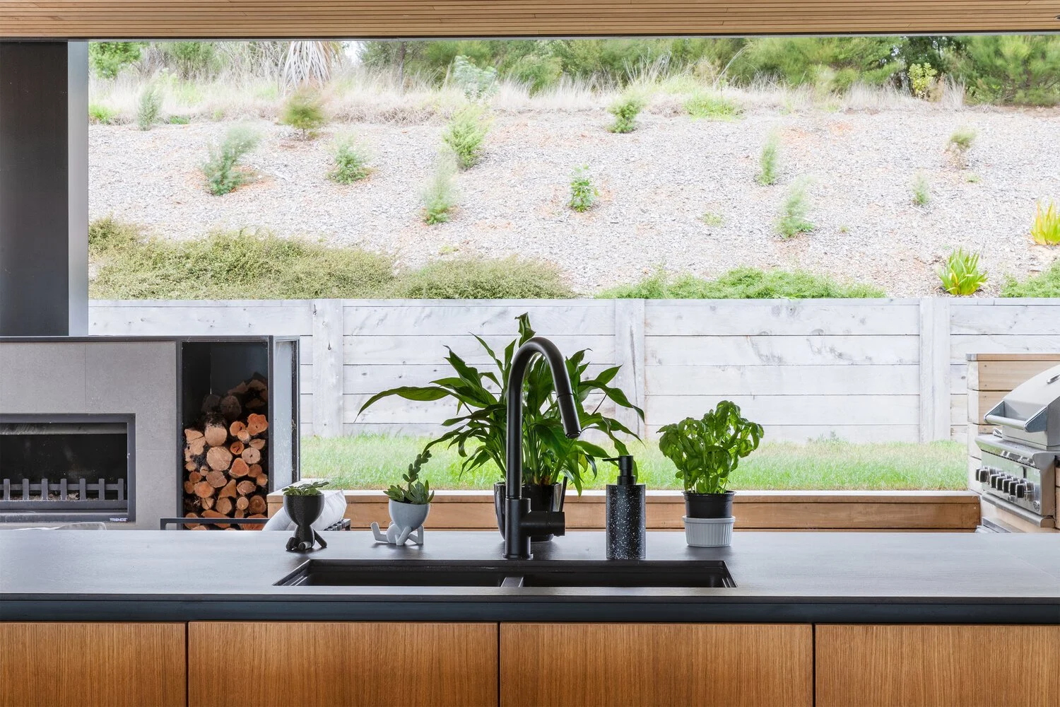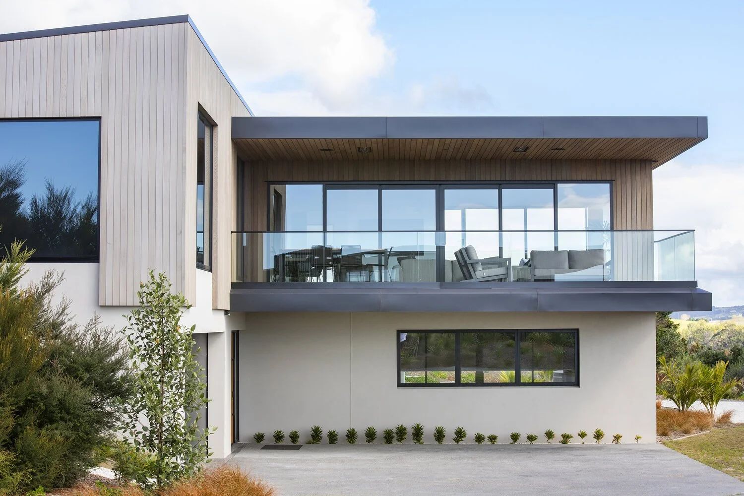Built on a stunning coastal site overlooking Mangawhai Heads, Jillings House is designed to celebrate its surroundings. The ground level is firmly anchored into the landscape, preserving the natural contours of the site. Above, cedar cladding gracefully wraps over windows and extends beyond the lower level, creating a sense of lightness. Cantilevered balconies and cedar slat screens provide sheltered outdoor spaces that perfectly frame the spectacular views.