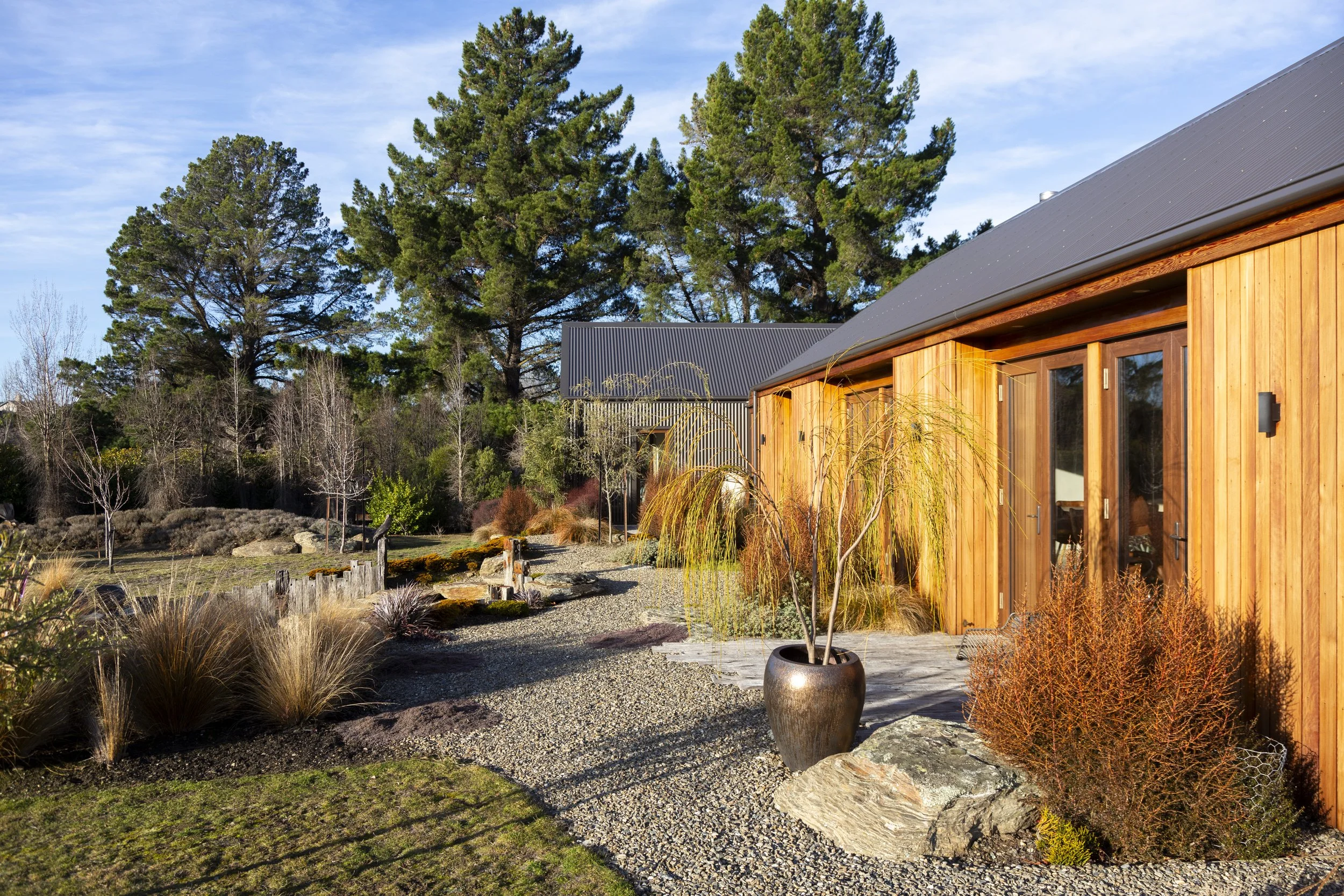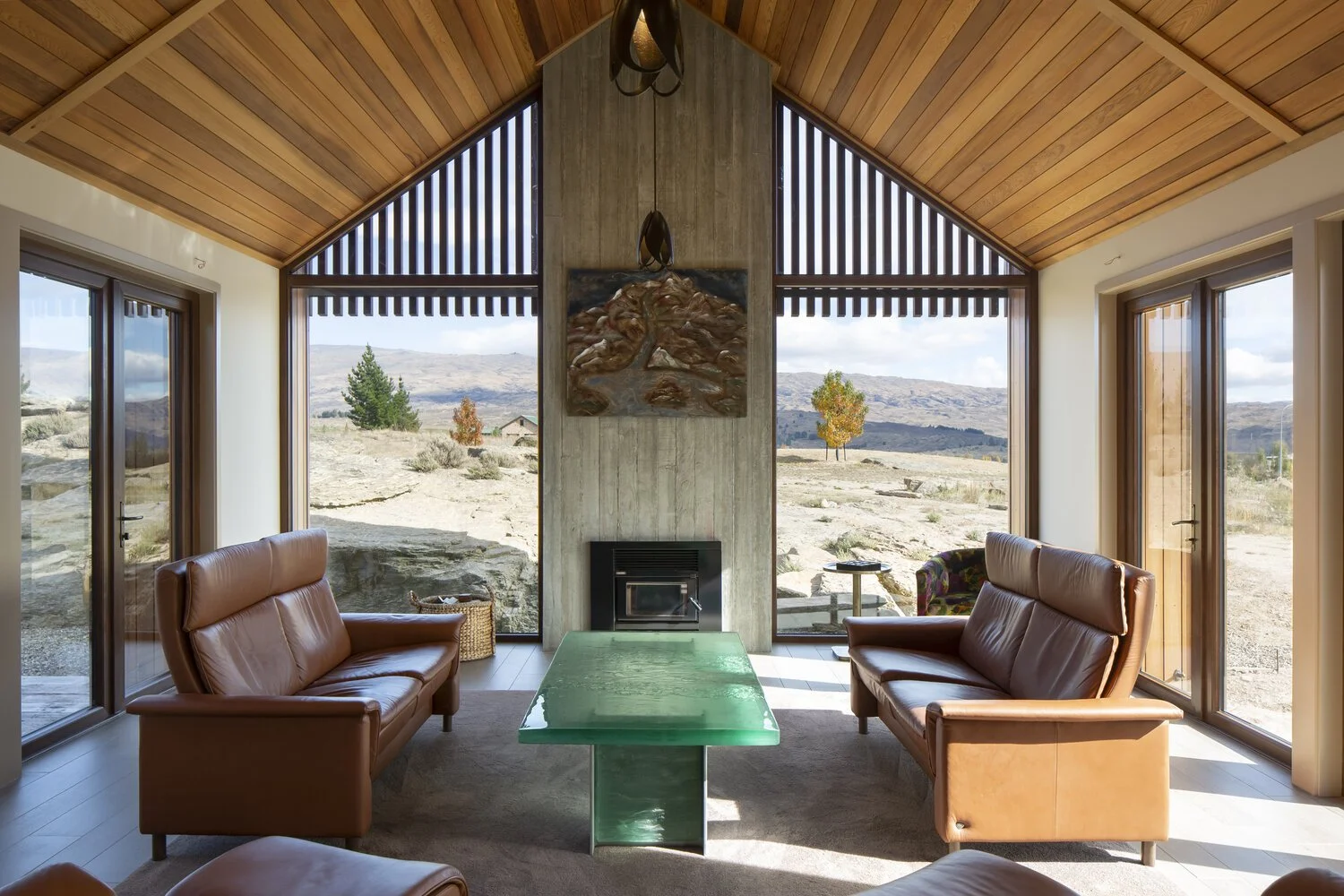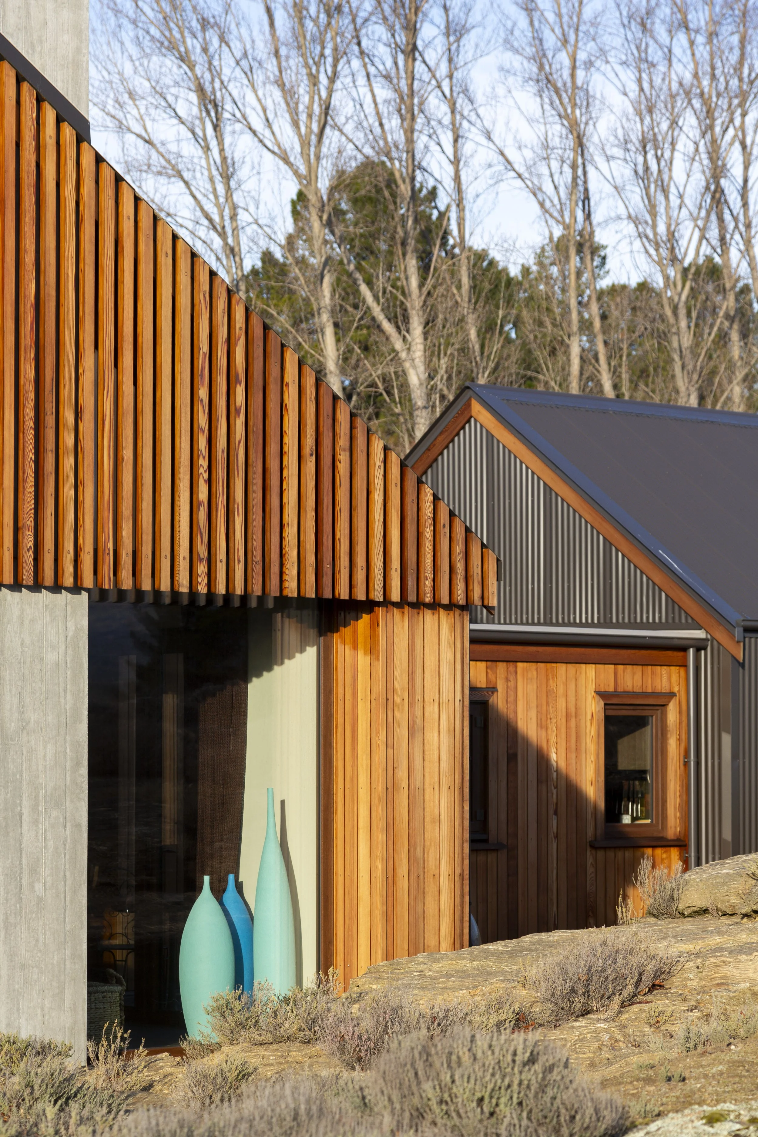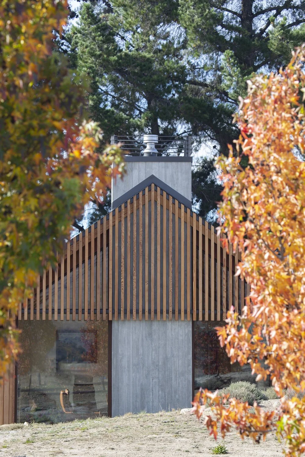 The three gable forms of Maxwell House are nestled into the rocky site, with a thin roof line lightly sitting above. The forms of the house have been kept clean and elegant, with fine detailing used to offset the heavy stone and concrete elements.