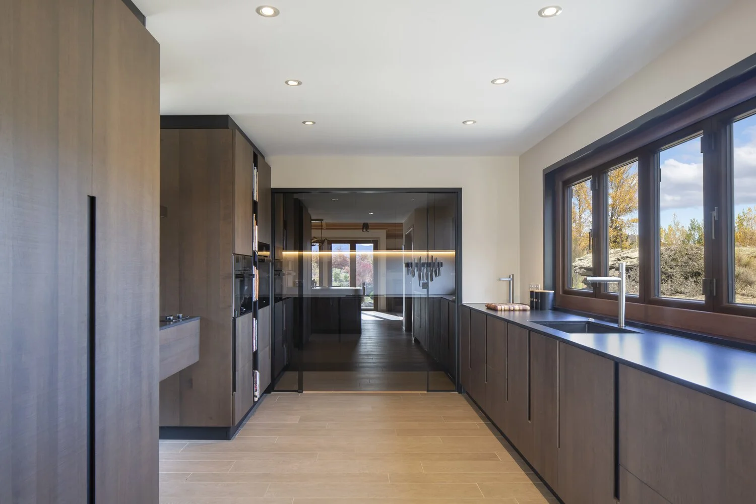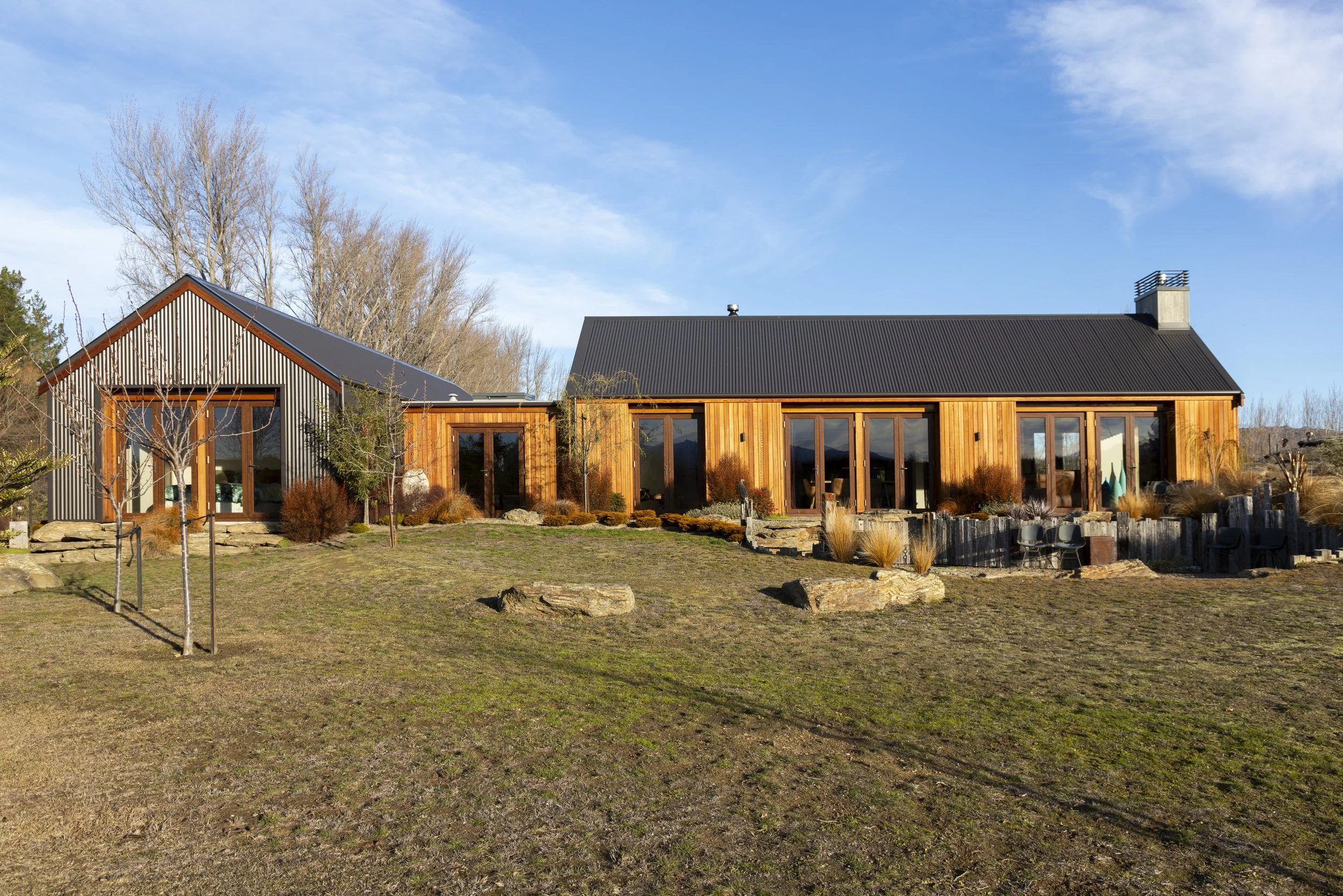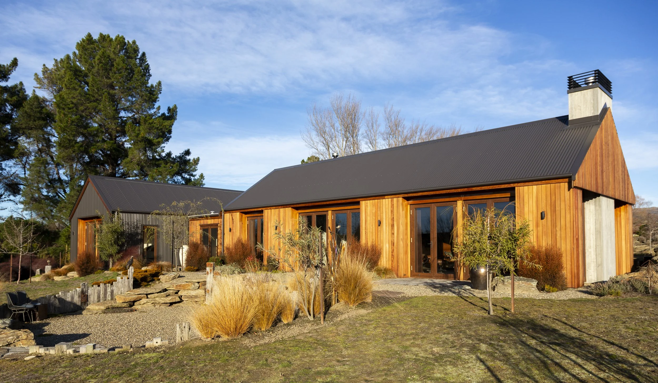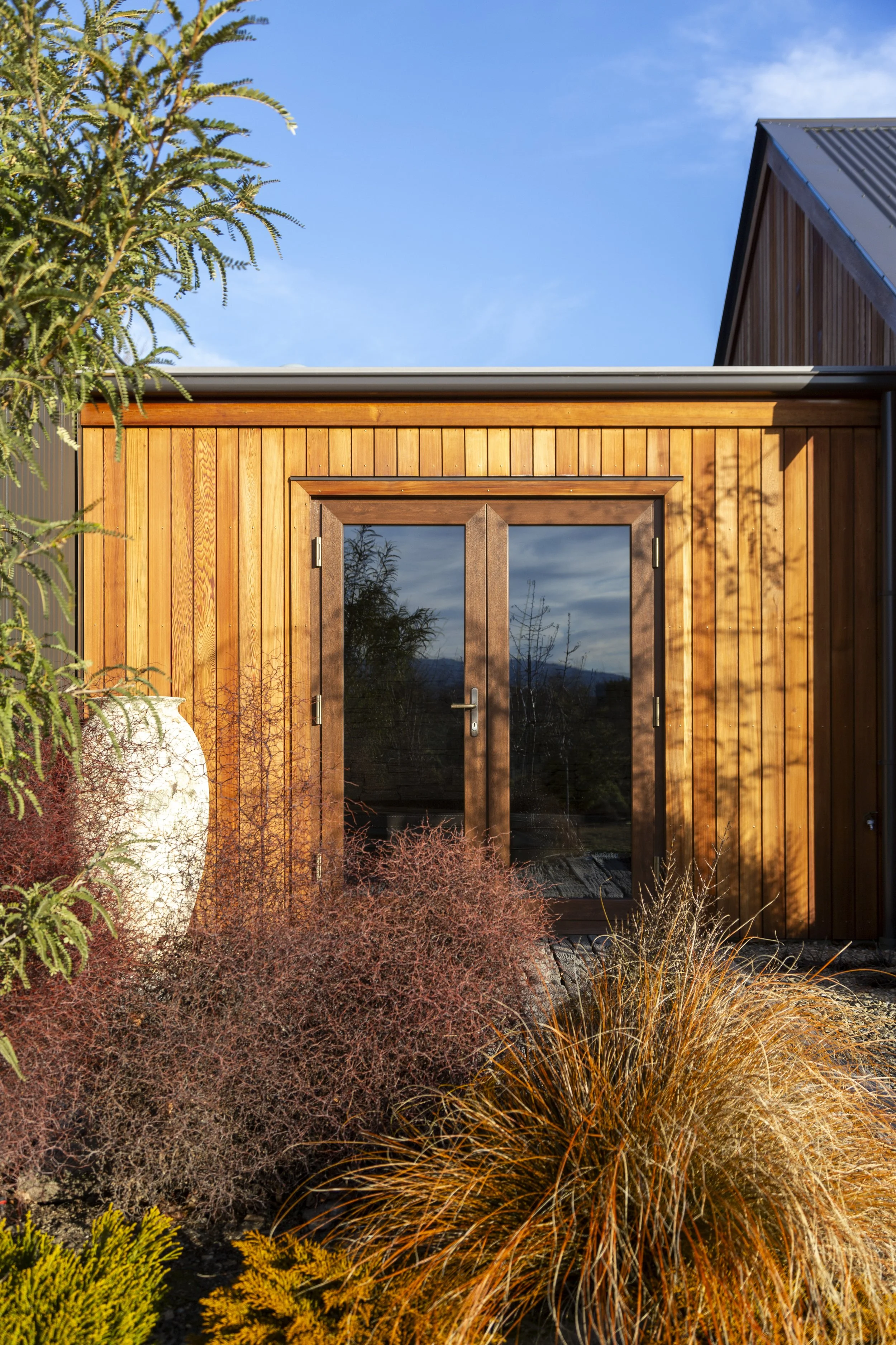 The three gable forms of Maxwell House are nestled into the rocky site, with a thin roof line lightly sitting above. The forms of the house have been kept clean and elegant, with fine detailing used to offset the heavy stone and concrete elements.
