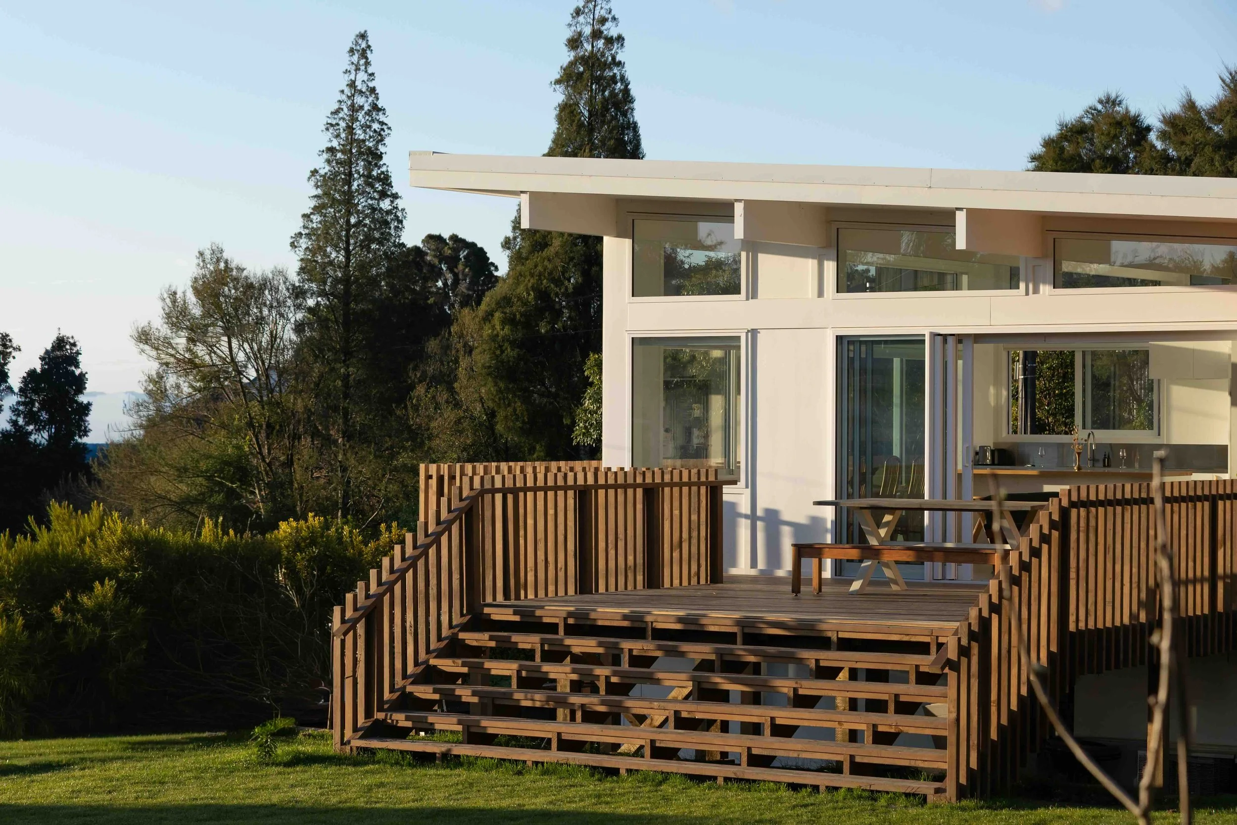 The slim roof sits lightly above the structure, complemented by grooved ceiling linings that add texture and depth.The entire building was prefabricated using Potius floor, wall, and roof panels, allowing for a precise and efficient on-site assembly.