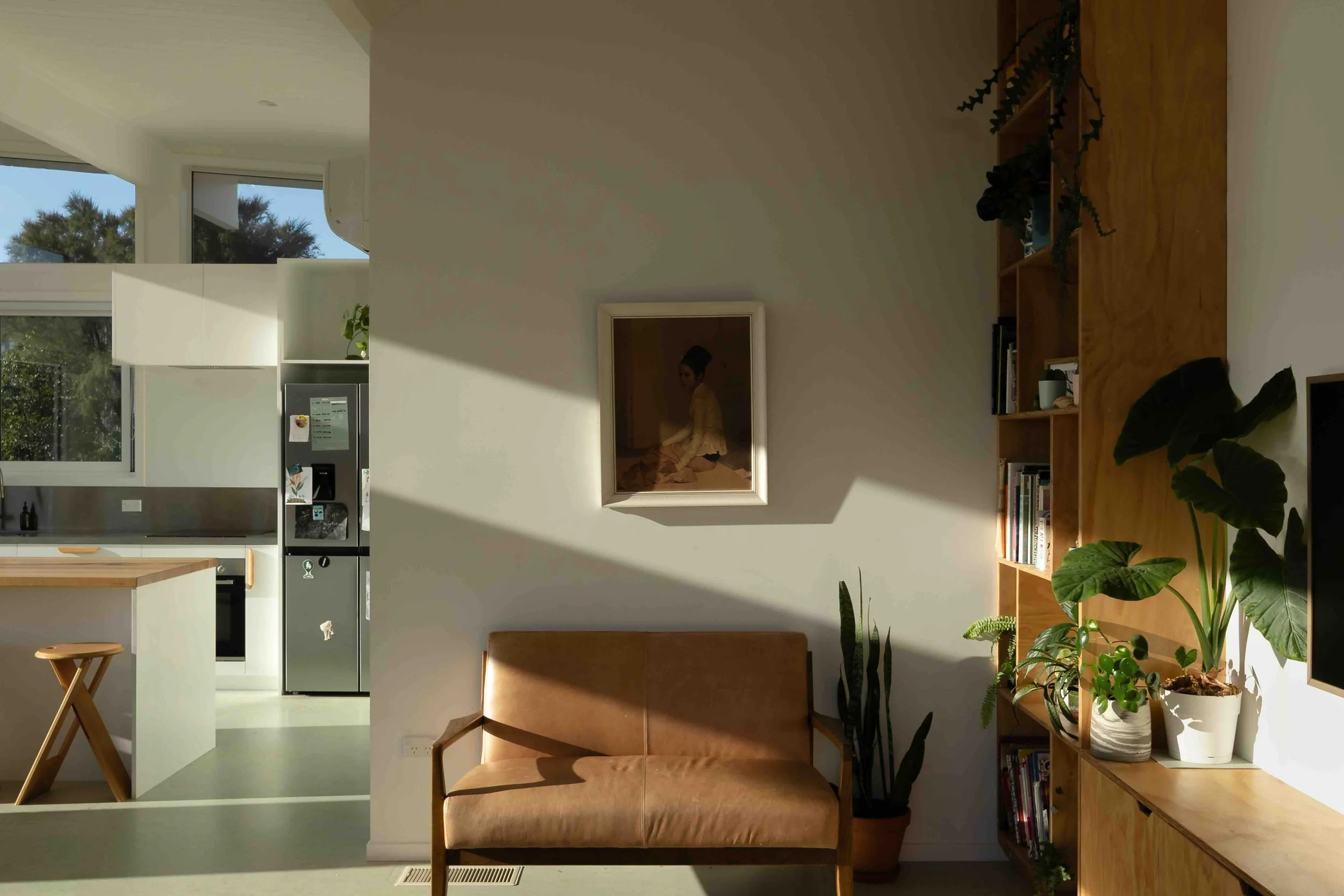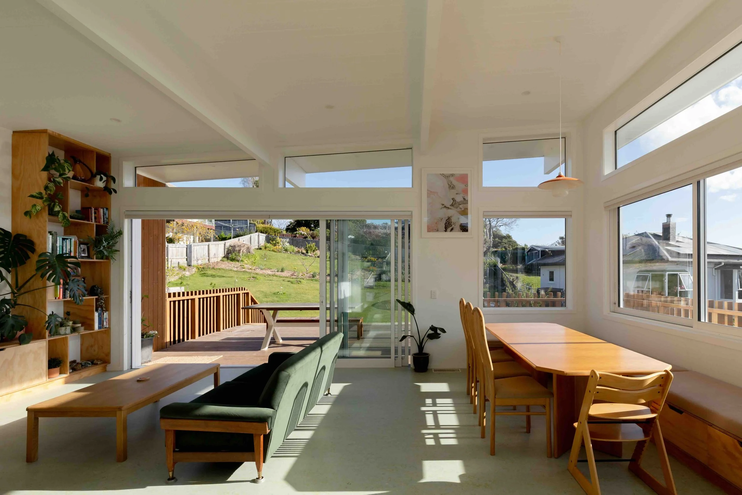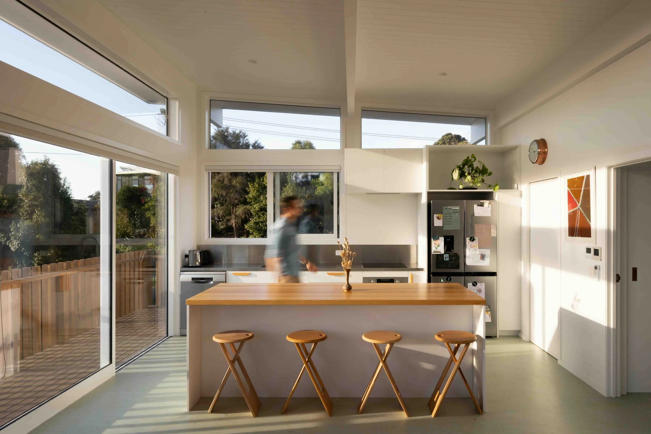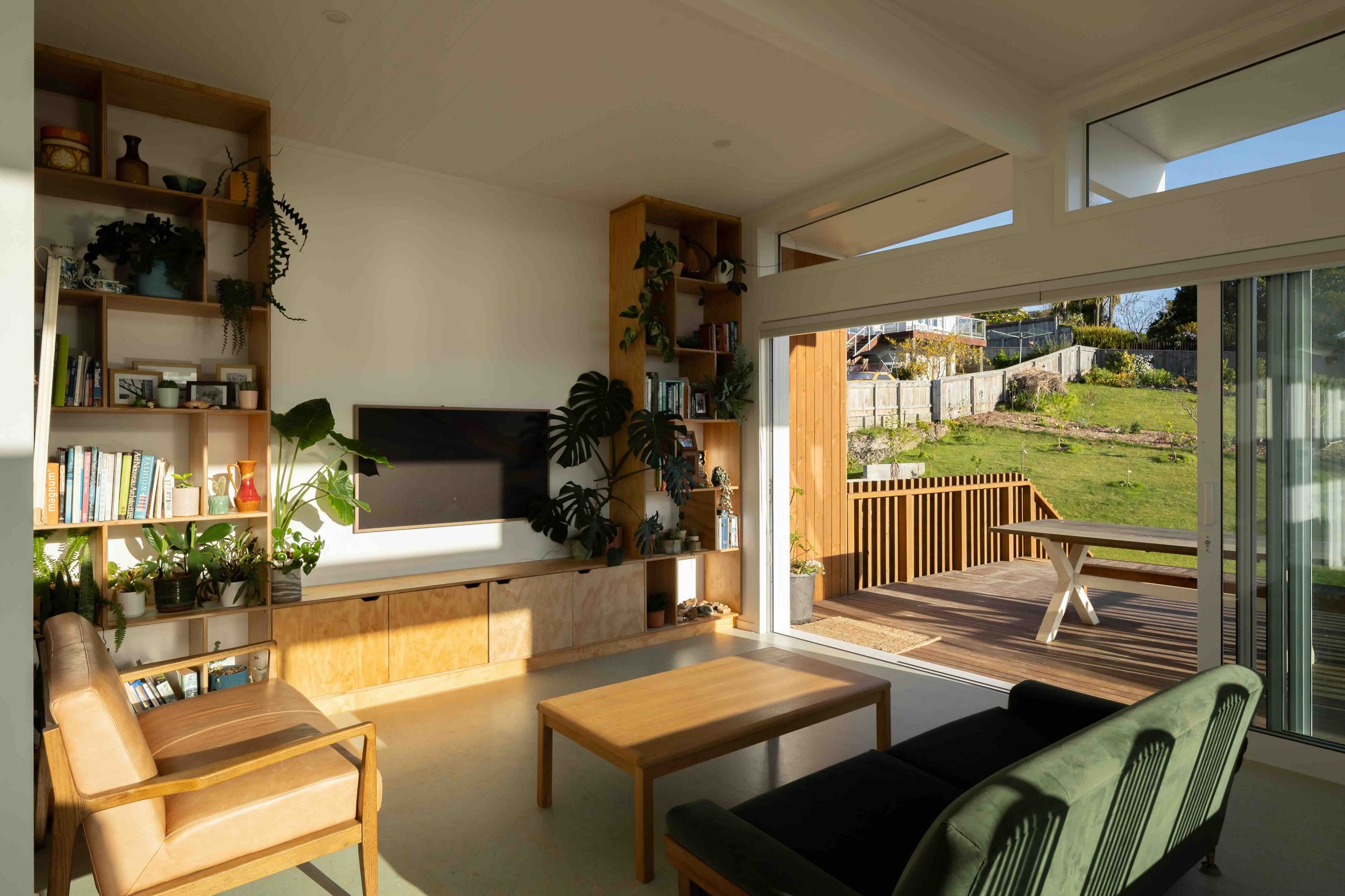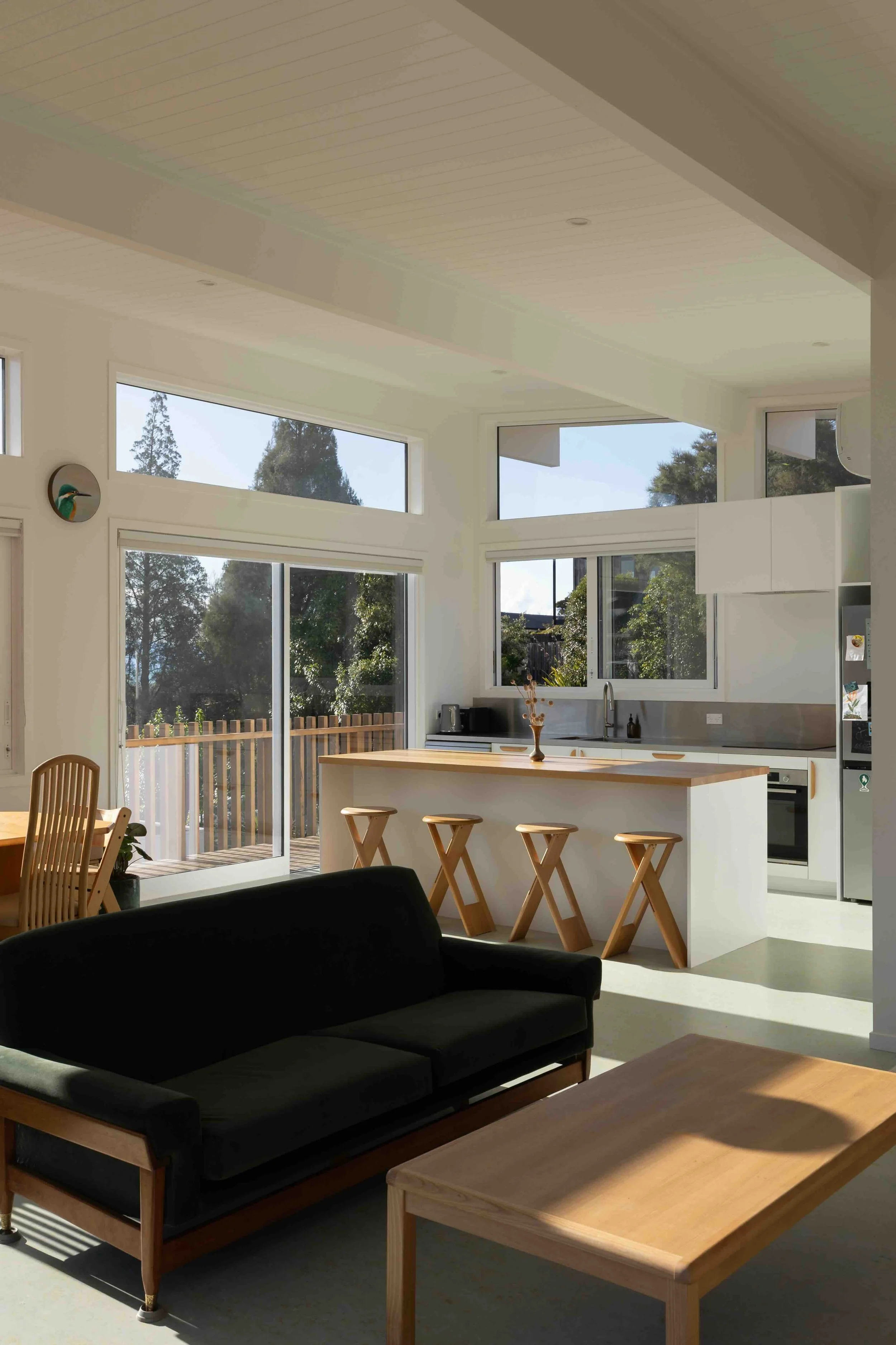 The footprint of the garage created some challenging design constraints that we’ve overcome while keeping the construction costs in check. The resulting home features a sweeping roof form that creates a high-stud living area, with exposed LVL beams offering a subtle nod to modernist architecture.