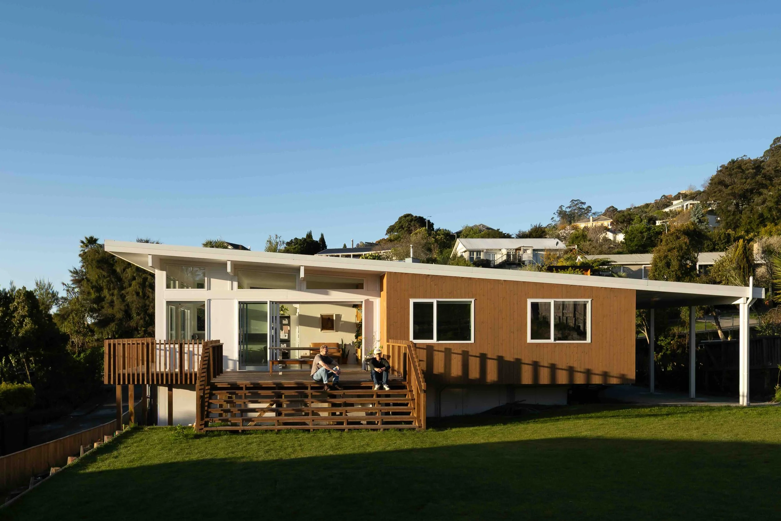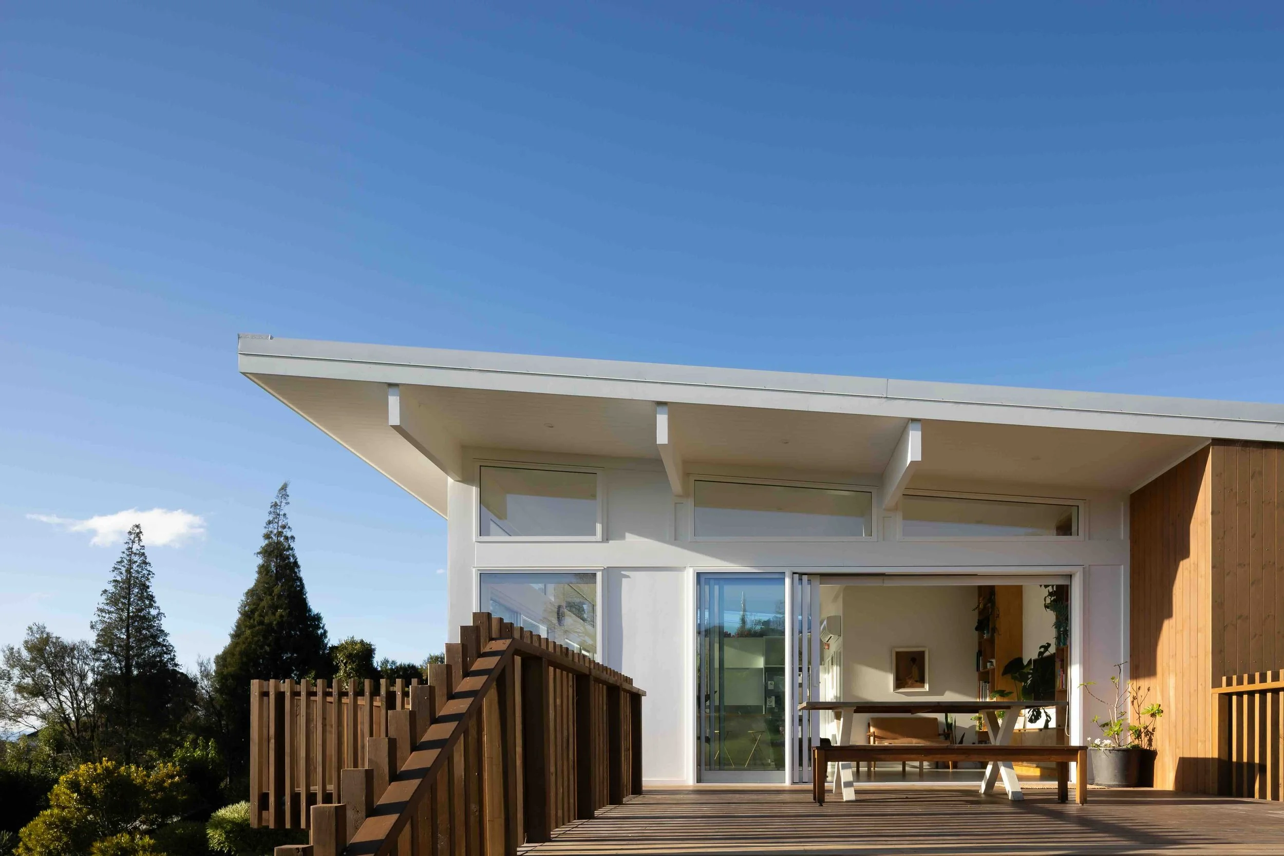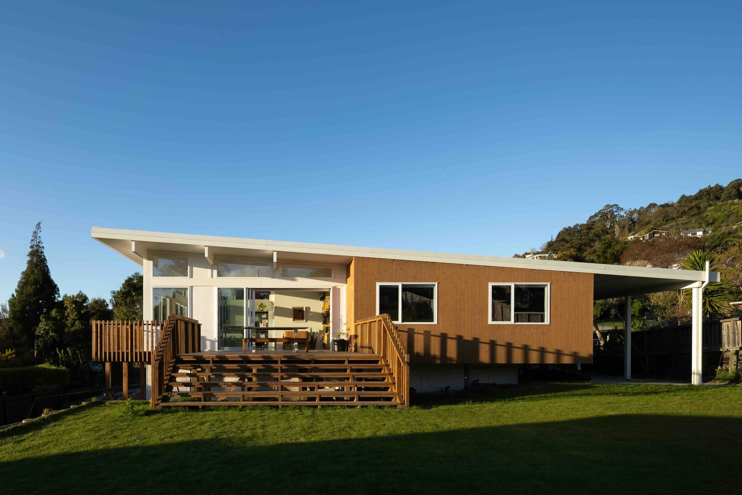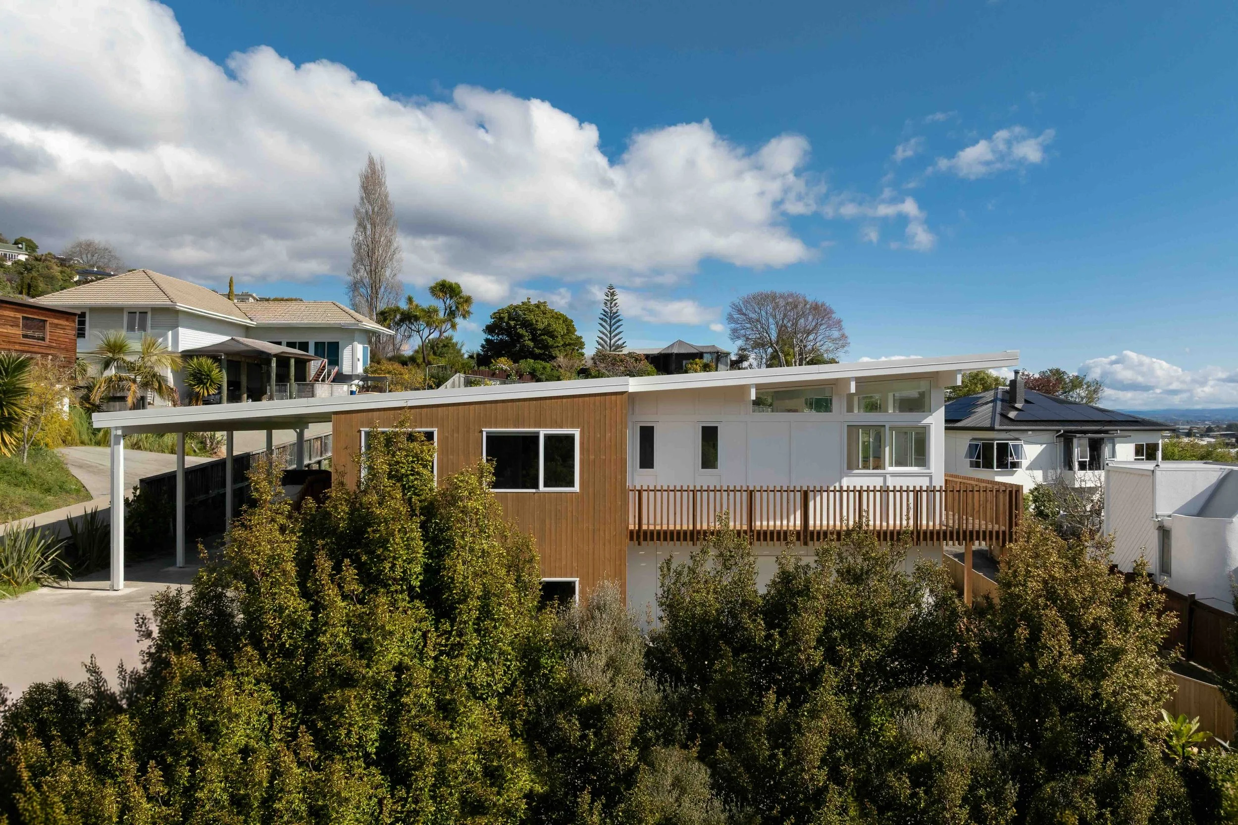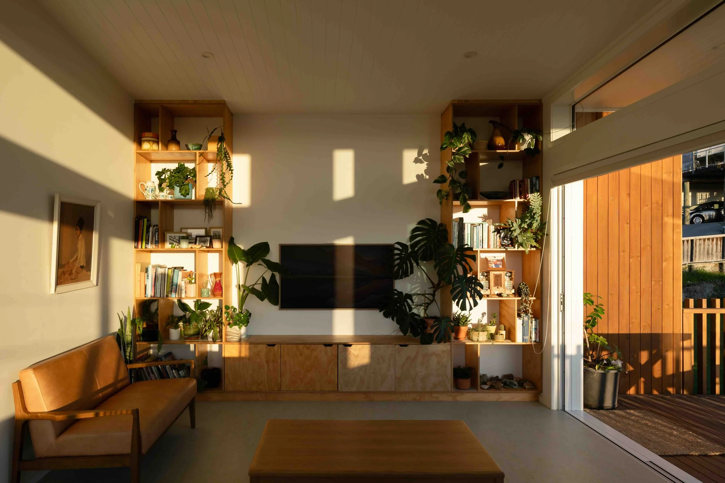 The footprint of the garage created some challenging design constraints that we’ve overcome while keeping the construction costs in check. The resulting home features a sweeping roof form that creates a high-stud living area, with exposed LVL beams offering a subtle nod to modernist architecture.